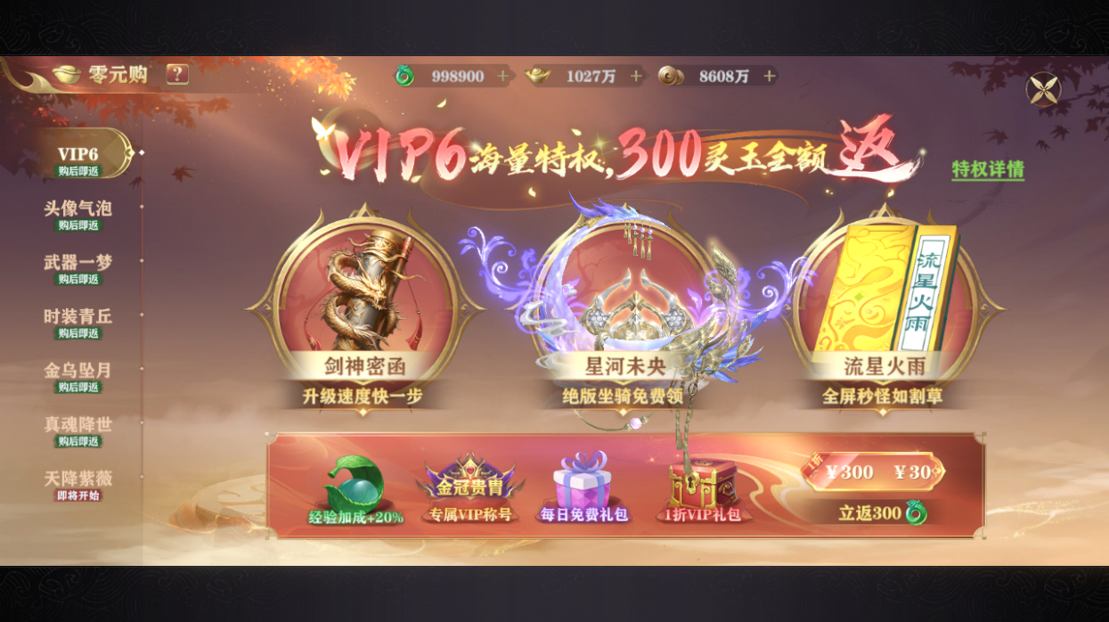 4.0元购30的特权可以直升v6性价比很高;v6原价需要1500元 |