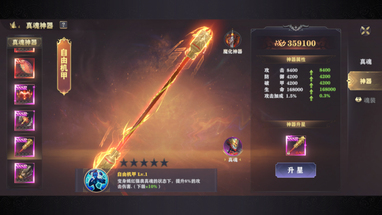 真魂的升星和神器的升星战力加成性价比最高